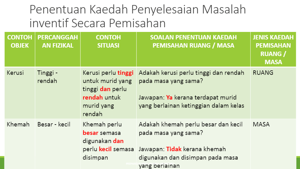Penyelesaiaan masalah secara inventif ; Penentuan kaedah penyelesaian masalah inventif secara permisahan contoh objek percanggahan fizikal . Pelajar yg rendah dan tinggi.meja yang boleh menyelesaikan masalah adalah meja yang kakinya ada percanggahan tinggi dan . Masalah dapat diselesaikan tanpa kesan sampingan. Invensi dapat berupa produk maupun proses. Contoh manakah yang menunjukkan masalah inventif? Al ini ialah contoh masalah inventif. Masalah yang mempunyai kesan sampingan apabila usaha penambahbaikan berlaku ;